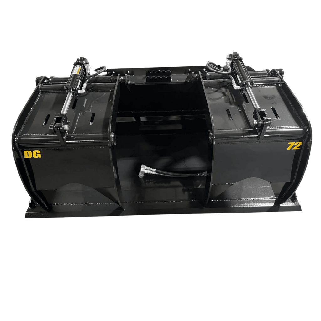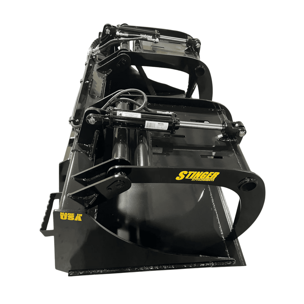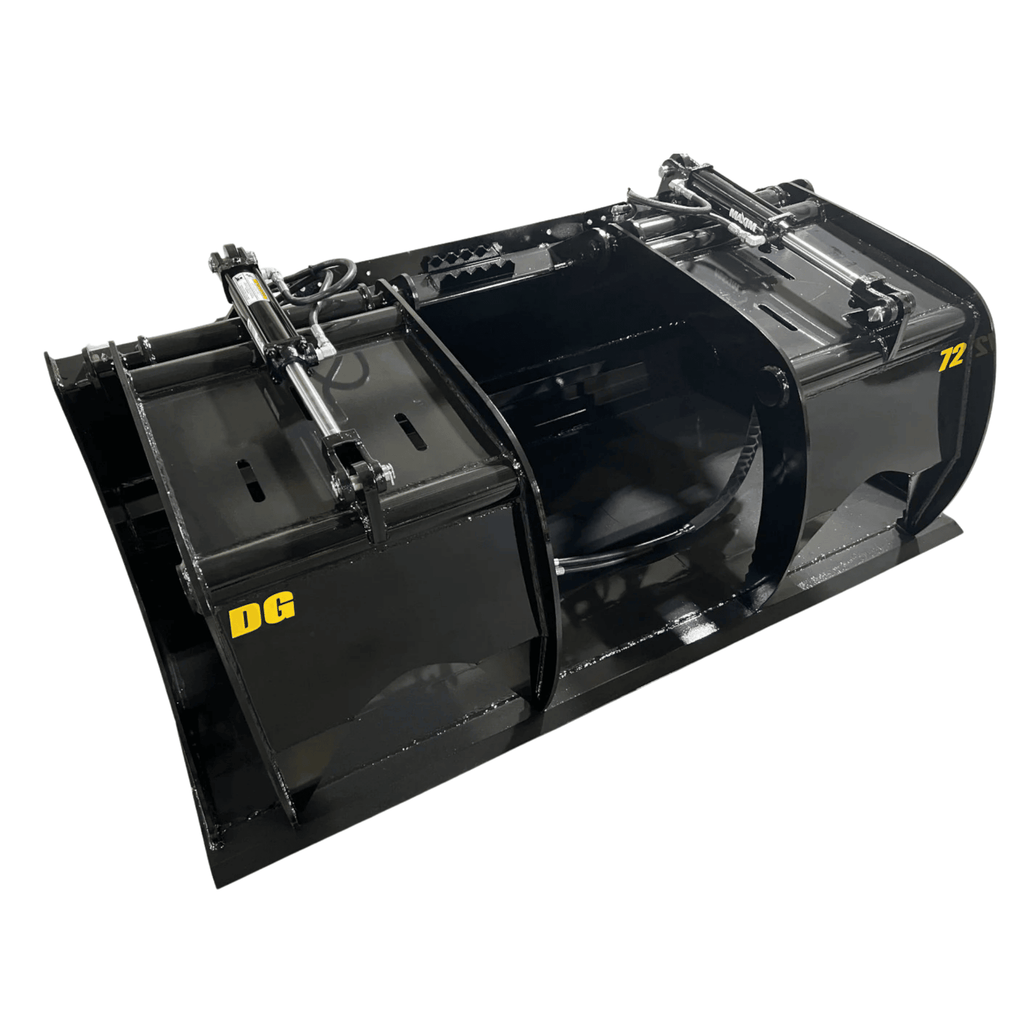 The Stinger DG Series Demolition Grapple is the ultimate hybrid between a dirt bucket and a grapple. Unlike skeleton grapples that let small material fall through, the DG features a **Solid Bottom Shell**. This allows you to scoop up fine debris, gravel, and trash while still using the powerful dual clamps to secure uneven loads like concrete slabs, logs, and scrap metal.