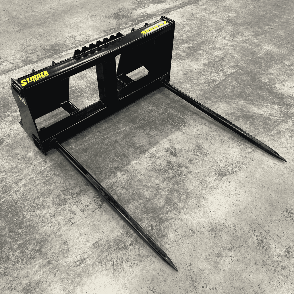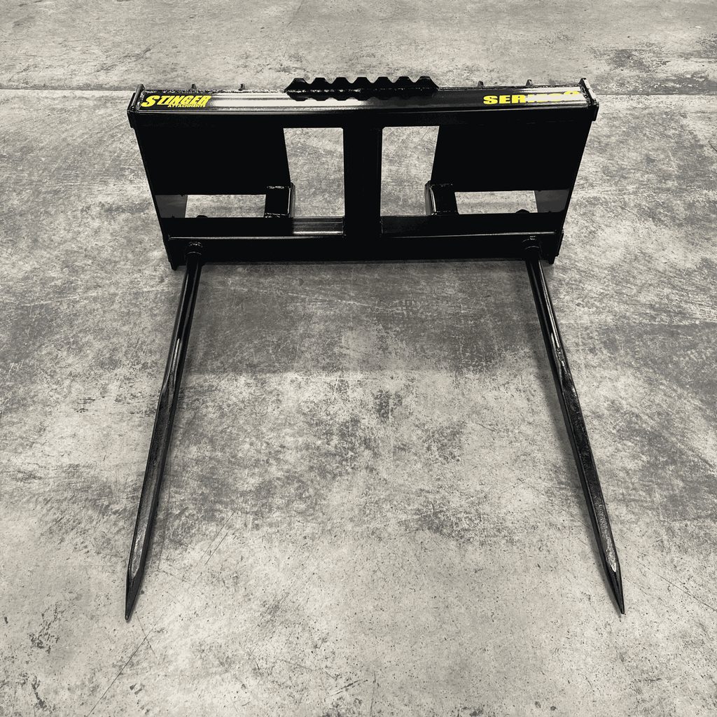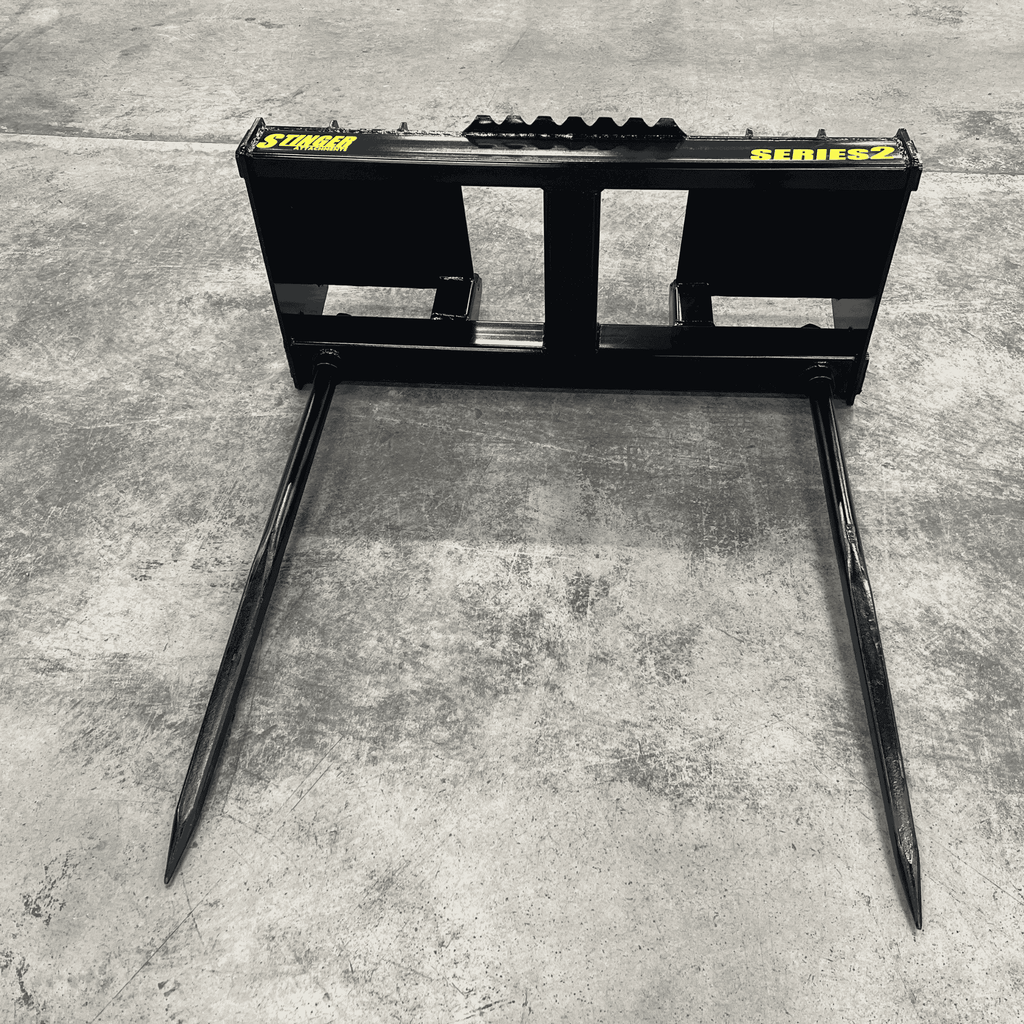 The Stinger Series 2 (Double Spear) is designed for operators who need speed and stability. Unlike single-spear designs where the bale can spin or shift during transport, the Series 2 utilizes two parallel Conus 2 spears spaced 39" apart. This locks the bale in place, allowing you to move faster across uneven terrain without losing your load.
