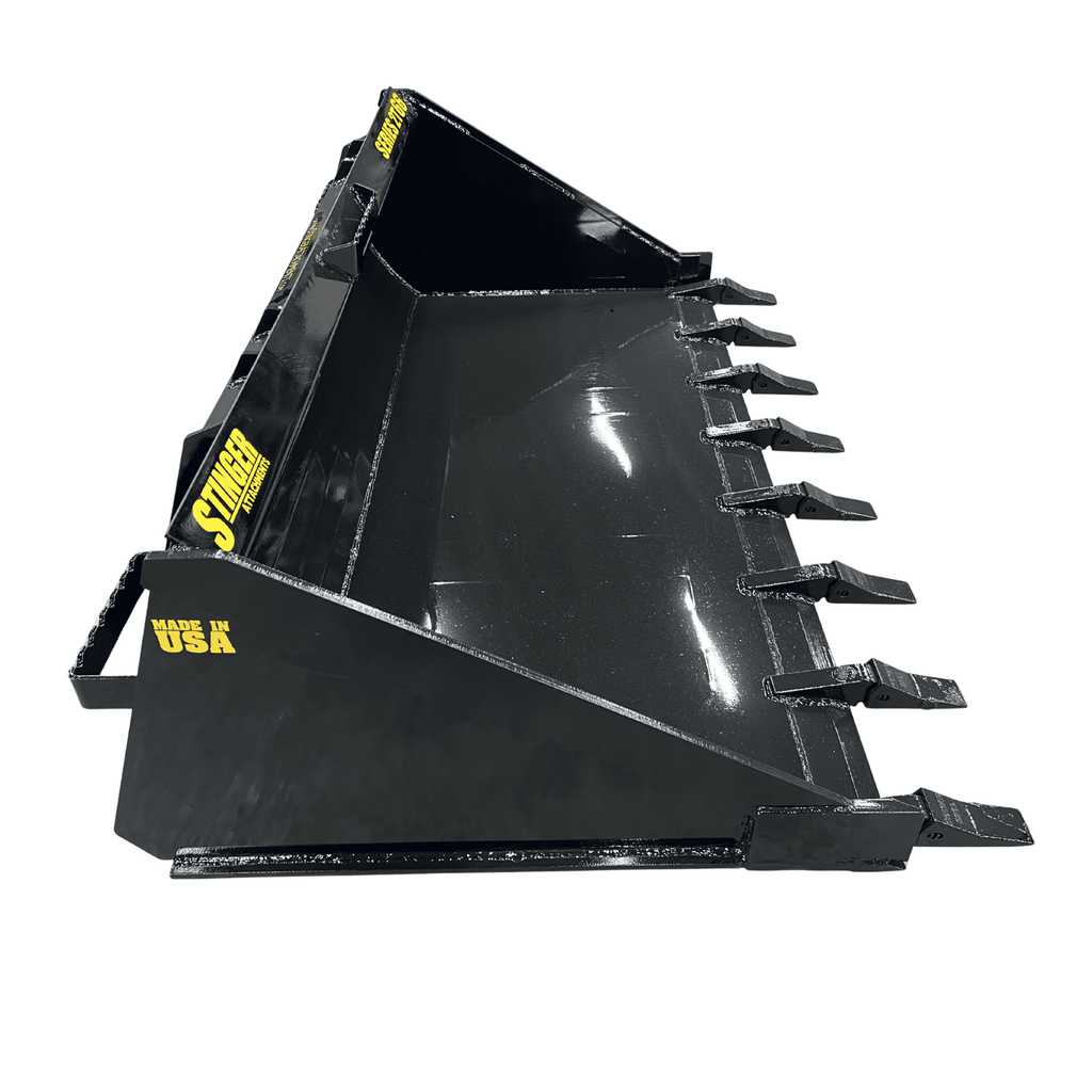 Unlike low-profile dirt buckets that spill material, the TB Series is built on Stinger's Deep-Bottom Chassis (Series 2 dimensions). With a 40-inch bottom depth and a heavy-duty 1/4" Grade 50 Steel Shell, it allows you to break ground and carry a full high-volume load without switching attachments.