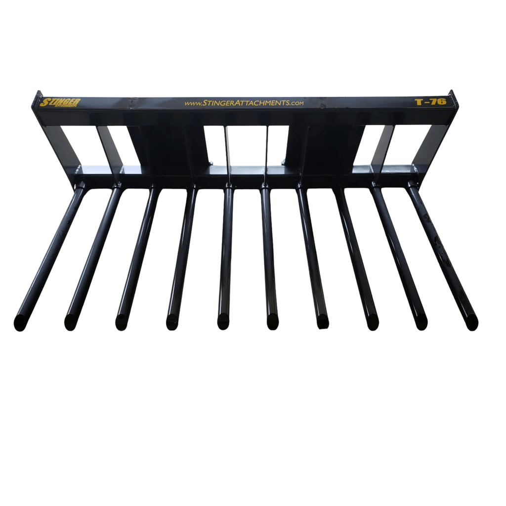 The Livestock Producer's Essential: The Stinger Attachments Manure Tine Bucket is engineered to penetrate loose or matted material effortlessly. Whether you are breaking up compacted bedding, moving silage, or clearing brush, the pointed tine design allows for easy entry and separation.