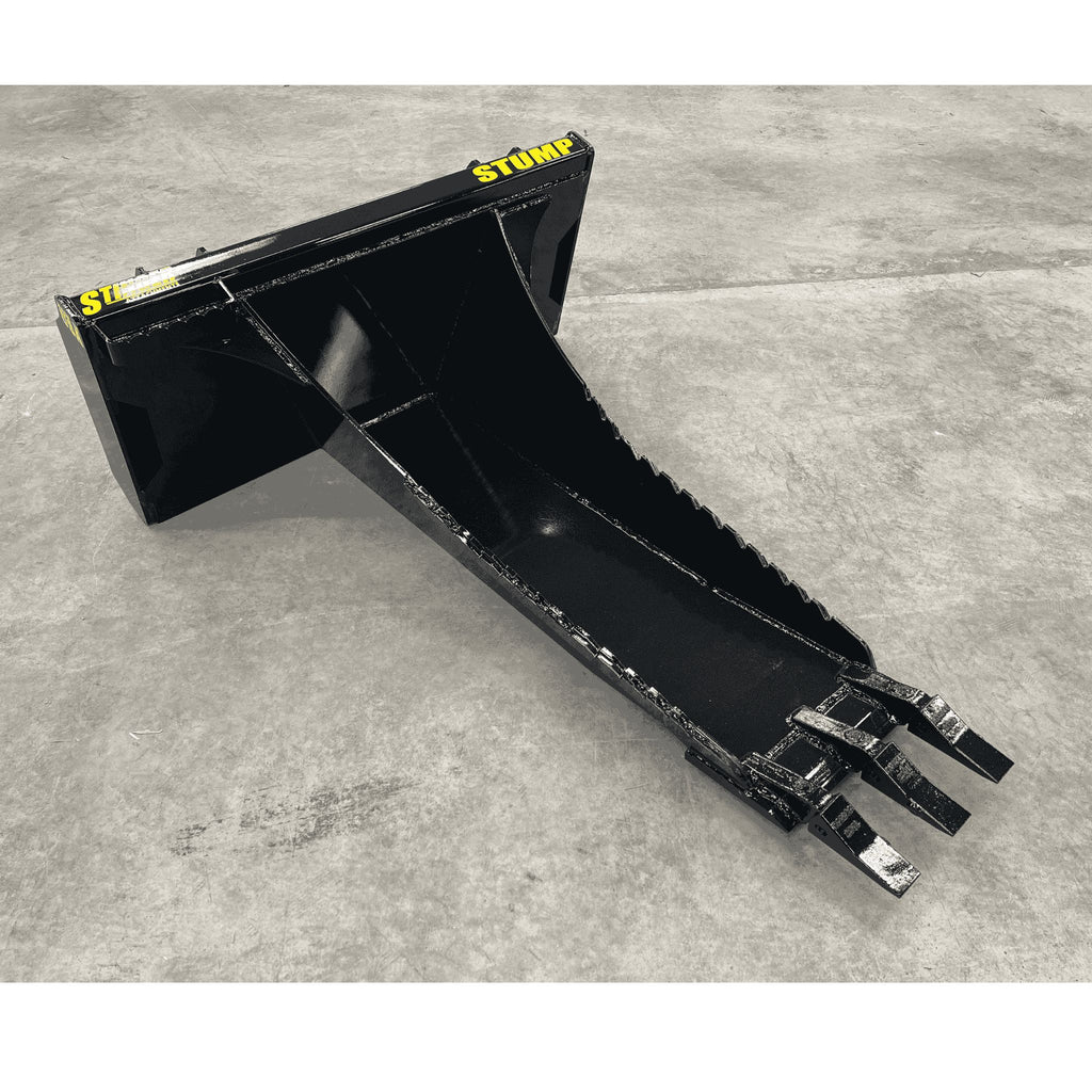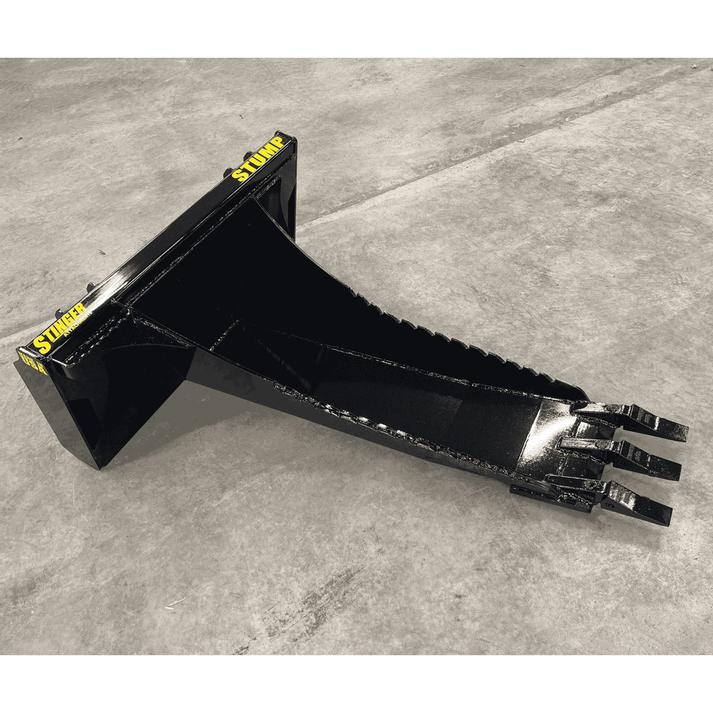 The Root Ripper: The Stinger Attachments Stump Bucket (STB) is engineered to remove stumps, not just dig around them. By combining a 52-inch Long Spade with a **Curved Bottom Design**, this tool acts as a giant lever. Simply plunge the spade under the root ball, and use the curved heel as a fulcrum to pry the stump straight out of the ground.