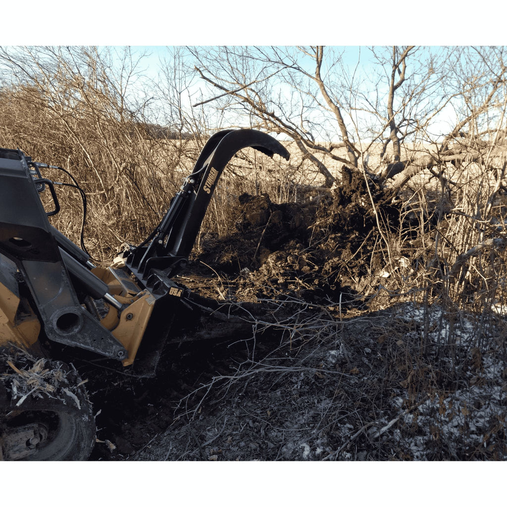 Secure Your Load: Built on the proven curved-bottom chassis of the Stump Bucket, the STG plunges 52 inches deep to pry out stubborn roots. Once the stump is loose, the 3" x 8" Hydraulic Cylinder locks the grapple arm down, securing the debris against the serrated teeth. This ensures you can carry heavy stumps, rocks, and logs safely without them rolling back out.